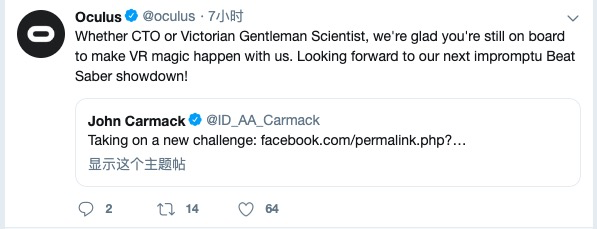 Oculus 官方在推特上确认了这一消息并表示,很高兴卡马克还“在公司”一起创造 VR 奇迹。