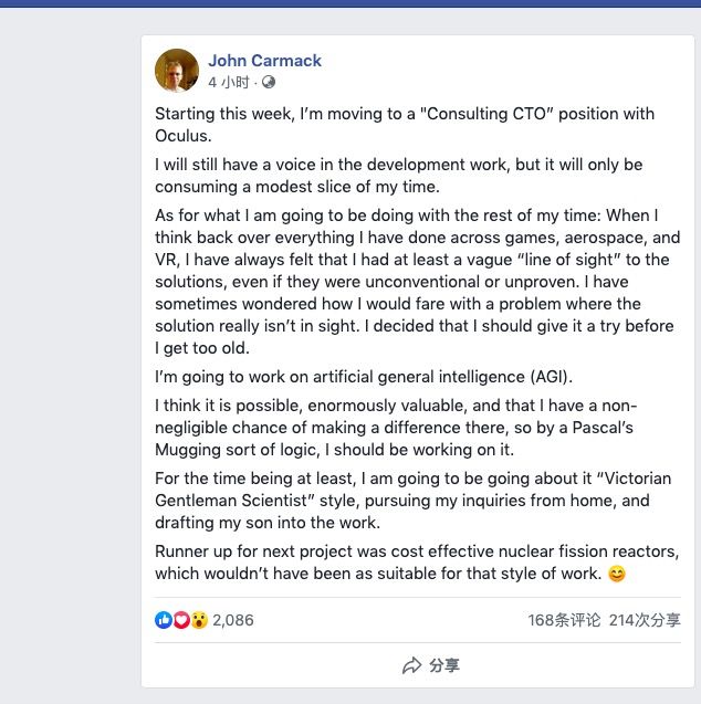 导读:去年才刚刚 入坑 AI 的传奇程序员约翰·卡马克宣布将正式投身 AI 事业。近日,卡马克在自己的脸书上发出“告别帖”宣布将不再担任 Oculus 首席技术官。和之前从自己创办的游戏公司离开的缘由一样,他又找到了新的兴趣点。这一次,49 岁的卡马克决定要趁自己还没变老之前投身到「通用人工智能」的研究中去。在这个未来充满着挑战性和不确定性的领域,传奇程序员卡马克能否创造新的传奇呢?