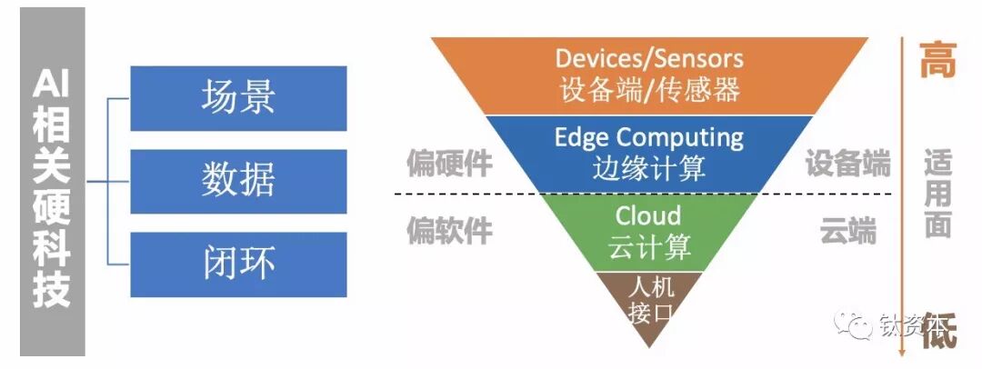在AI相关硬科技的投资逻辑中,需要关注场景、数据和闭环。上图的右边是一个参考架构,最上层是设备端,然后是边缘计算,最下层是云计算和人机接口。这个参考架构为什么是倒三角?因为上层的数量大于下层。以云计算为例,数据中心数量远远小于传感器的数量。另外,虚线上面偏硬件,下面是软件;上层偏设备端,下层偏云端;从适用面来讲,上层的适用面高于下层,下层的场景可能非常特定。