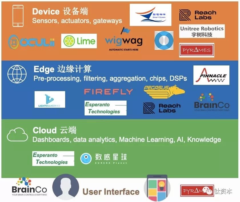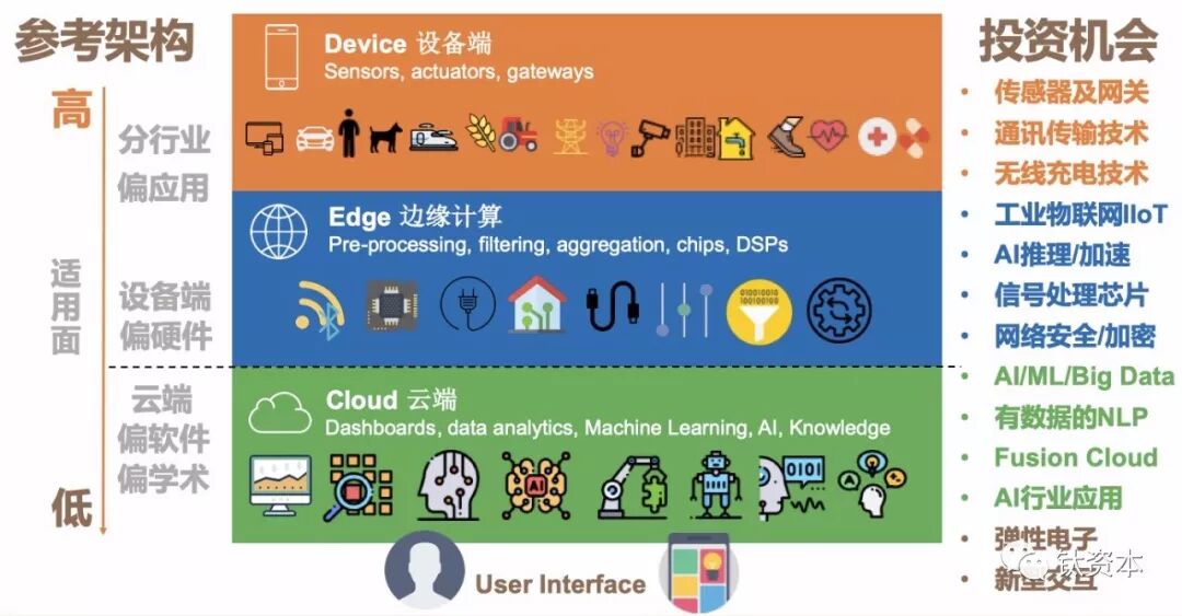 最下两层是云端以及用户界面。云端包括仪表盘展示、数据分析、机器学习和AI。AI分两个层面就是训练和推理。一般AI训练在云端完成,而不是在边缘端,因为需要大量的计算能力、计算资源,所以训练一般在云端;推理可以在边缘端也可以在云端做,现在更多倾向从云端向边缘端转移,这时可以带来很多投资机会。最下层是新的人机交互方式,在交互的方式上也有投资机会。