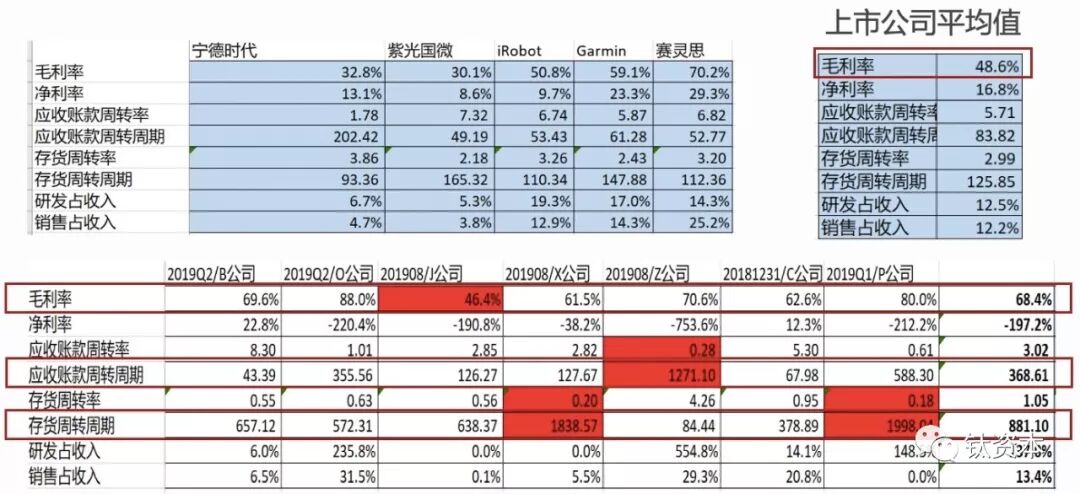 对比的被投公司以红色标注。第三列J公司是做机械臂的,毛利率相对其它被投公司较低,因为该领域可能竞争相对比较激烈,或产品性能还赶不上竞争对手,因此值得注意。第四列X公司是做激光设备的,一个核心的部件是特定频谱激光头,目前全球只有一个厂商供货,为了保持该产线的运作,每季度需要订一批货,导致存货多、消耗存货的周期长。