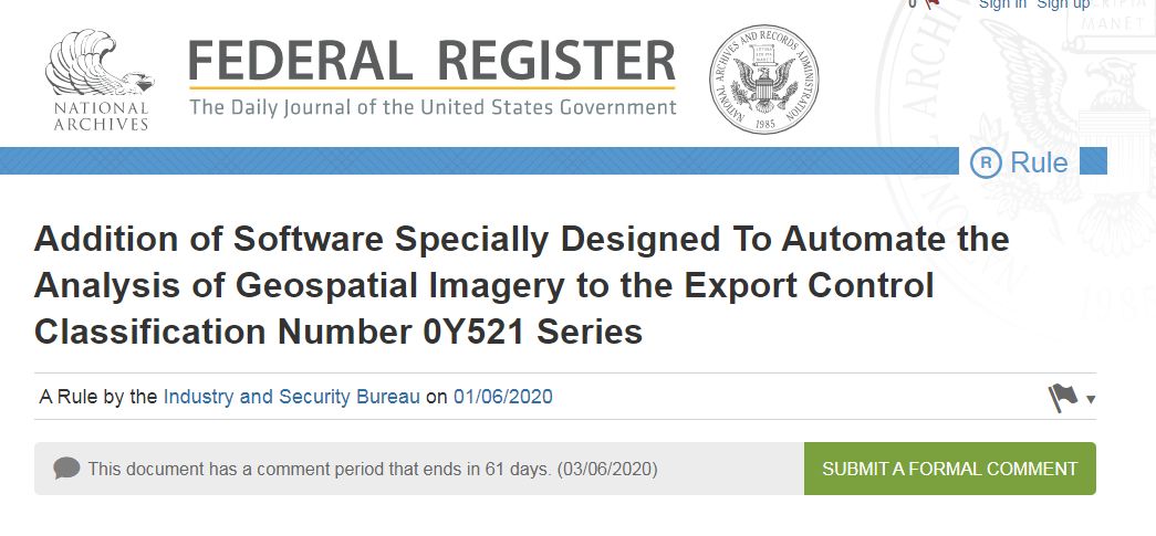 新的文件在出口管制分类号0Y521下增加了一个用于自动分析地理空间图像的软件。根据美国联邦政府文件的规定,这类软件是指专门设计用于训练深度卷积神经网络,以自动分析地理空间图像和点云的地理空间图像软件,并具有以下特征: