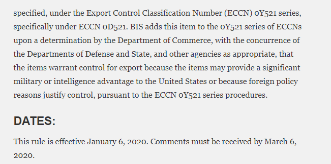 美国政府正在制定更详细的计划,以限制美国工业的出口。美国商务部的提案中指出,限制出口的国家包括中国、俄罗斯等和美国产生贸易问题的国家。目前禁令只在美国生效,美国政府不排除向国际组织提议全球各国采取同样措施,以创造全球公平竞争的环境。美国已有不少科技企业和研究学者呼吁美国商务部在1月10日公众评论截止日期之前,放宽禁令措施减少美国企业可能蒙受的损失。