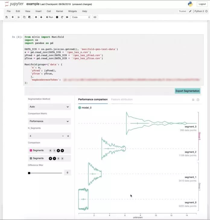 与Jupyter Notebook集成:通过这种集成,Manifold将数据输入作为Pandas DataFrame对象接受,并在Jupyter中呈现此数据的可视化。由于Jupyter Notebook是数据科学家和ML工程师使用最广泛的数据科学平台之一,因此该集成使用户可以在不中断正常工作流程的情况下分析其AI模型。