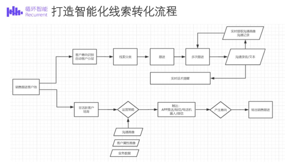 循环智能结合客户的通话数据(录音、文本)和业务数据(历史沟通、成交情况),将对话进行语音转写、语义理解,并拆分成上百万的对话切片;接着把片段跟业务结果进行比对,计算出什么样的对话跟转化率最相关,就可以得到一个线索评分模型。