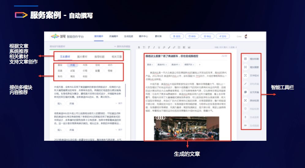 这些方向也是妙笔智能探索的重点,它主要提供中文内容的撰写、改写、发布服务,基于文本自动生成视频也是其一大亮点。