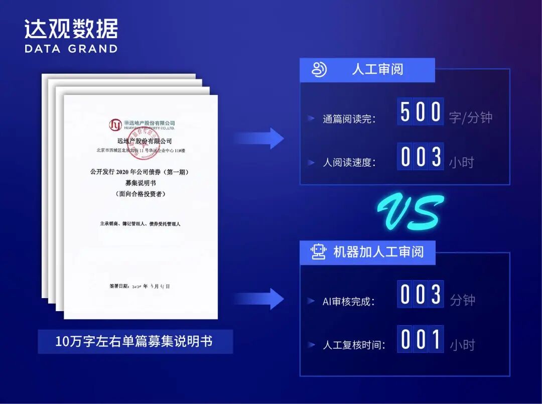 达观财债通针对券商常用文档审核痛点,综合运用语义理解、计算机视觉、深度学习等技术,打造出一个全面、精准、高效、自动的可视化AI审核大平台。