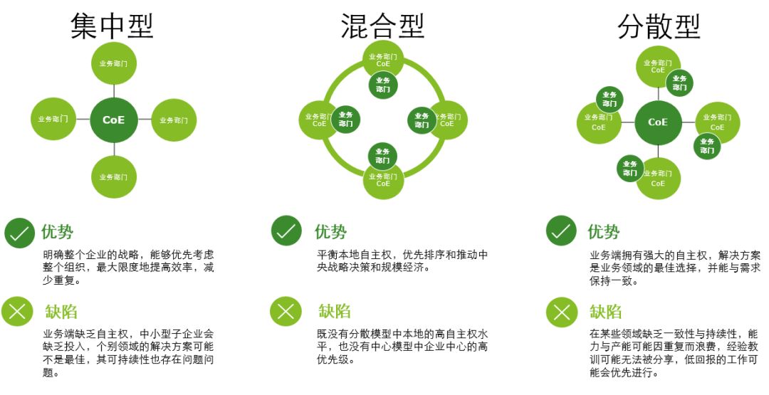 在组织架构选定的基础上,根据企业的业务模式,机器人卓越中心可采用的交付模型共分为3种:集中型、混合型、分散型。三种交付模型因企业的管理要求、部门能力水平的不同而各具优缺点。企业需要结合自身特点酌情选用。