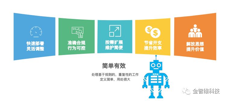 使用RPA软件机器人替代人来完成业务,可以提高工作质量和工作效率,提升用户体验,减少操作风险,使员工得以更专注于具有更高附加值的数据分析、决策和创新工作。