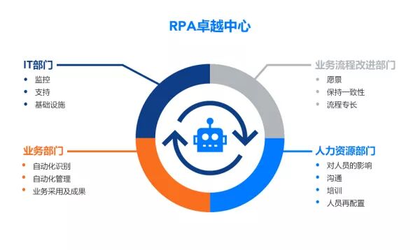 可见,RPA卓越中心是企业对于RPA实施的顶层构架设计。顶层设计先行有助于企业形成RPA统一战略,实现协同增效、改善整体运营和持续优化的目的。