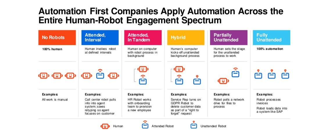 这一过程的自动化既需要有人值守的机器人,也需要无人值守的机器人。为了确保全通道的自动化体验,还需要支持会话理解人工智能(AI)的技术。