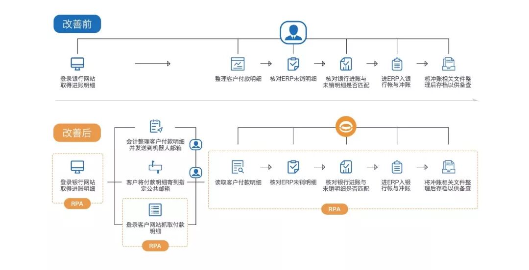 在客户对账流程中,由天匠智能机器人协助可以显著提升对账速度和准确率,并通过预设业务逻辑归集银行各项收费。