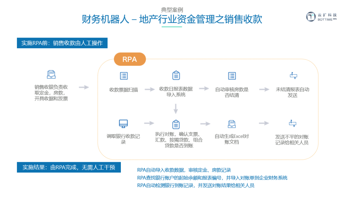 由于地产行业的特殊性,销售收款一般需要分为几个步骤进行,从定金到尾款的支付,每一次还需要对应收据和发票的开具。在客户众多的情况下,大量的数据处理给销售的工作增添了几分甜蜜的烦恼。但RPA的应用,就可以很好地帮助销售解决这些问题。