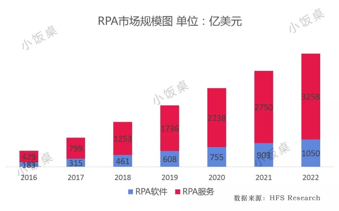 市场研究公司HFS Research发布的研究报告显示,2018年全球的RPA市场规模仅17亿美元,具体到RPA厂商瞄准的软件市场规模仅4.6亿美元,其余更大的市场都是提供产品部署和个性化开发的RPA服务。