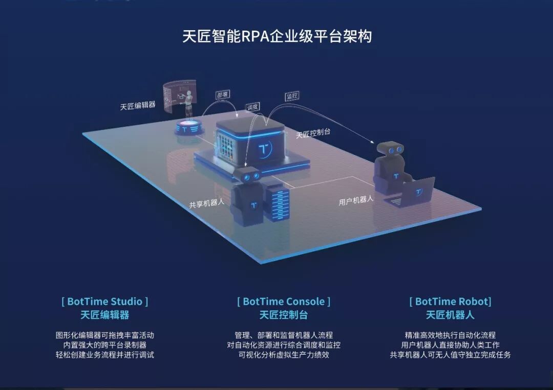 发展至今PRA已经相对成熟,主流的产品模型有三个部分组成:编辑器、机器人和控制器。编辑器负责设计业务流程,并传达给机器人执行,机器人会把执行的过程和结果上传给控制器,用户可以通过控制器调配机器人资源按计划完成各类工作。