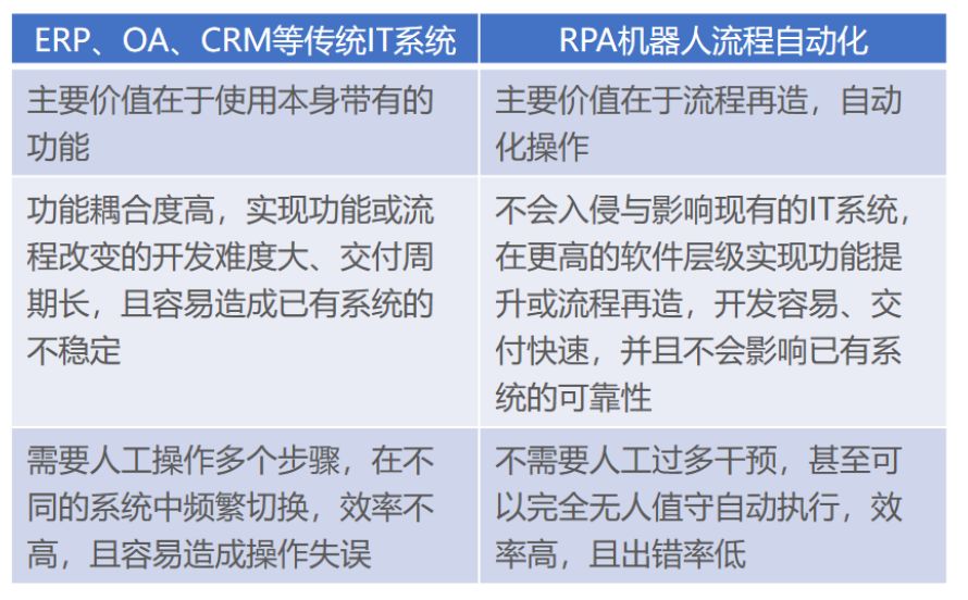 与传统的ERP、OA、CRM等IT系统不同,RPA其实运行在更高的软件层级。这就决定了它不会侵入影响已有的软件系统,而是在表现层对系统进行操作,从而在帮助企业提升效能的过程中,保持企业已有的IT系统功能平稳、运行可靠。