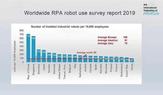 近日,IFR(国际机器人联盟)公布了一份关于RPA机器人流程自动化的调查报告。通过对欧洲、美洲、亚洲等世界范围内的RPA机器人应用密度的调查发现,韩国每10000名工人中就有710个机器人,成为世界应用机器人密度最高的国家,而中国的机器人应用密度只有97,成为密度比较低的国家之一。