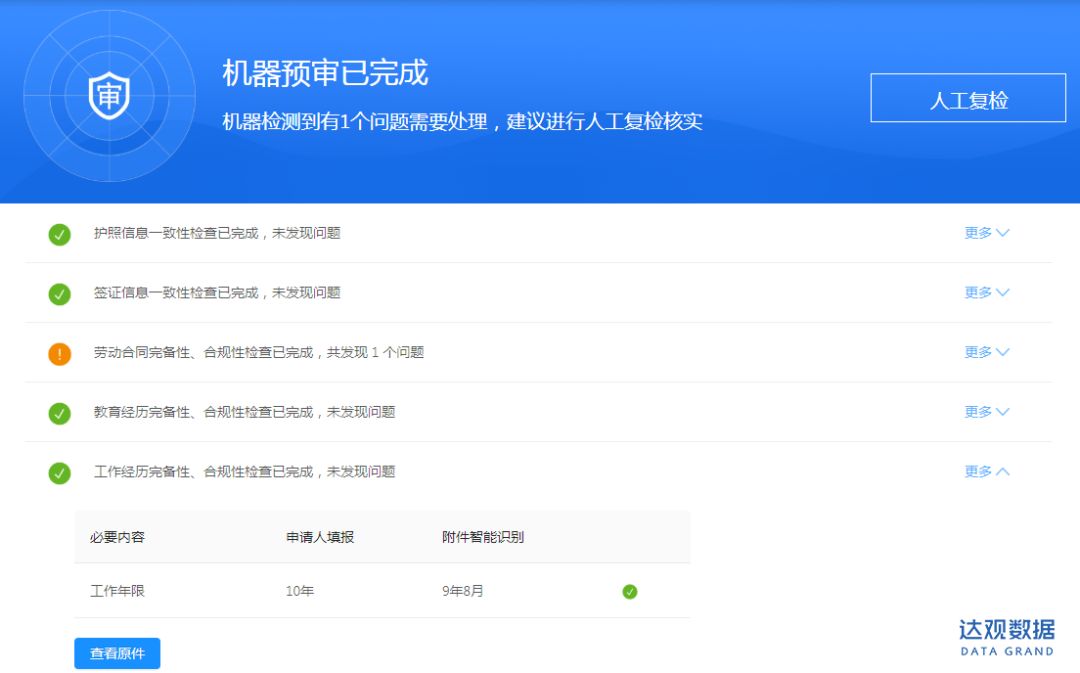 达观详细调研了日常一线人员的工作特点,并进行了提炼总结,在日常审批过程中,审核人员主要关注四个方面,即申请内容的完备性、一致性、合规性和真实性。