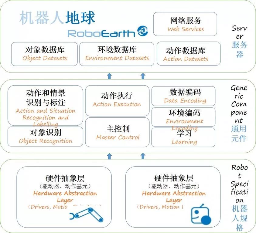 2001年,IEEE RAS创立“网络机器人专业委员会”,以推动相关研究。同时,自动化领域也开展了网络化控制等相关方向的工作,如基于代理的控制方法(agent-based control,ABC)等。代理,特别是移动智能代理的引入,加快了从网络机器人向软件机器人转化的进程。2009年,欧盟的“机器人地球(RoboEarth)”项目启动,目标宏大:提出要建立机器人自己的WWW,形成一个关于机器人的巨大网络和相关数据、知识和算法的机器人世界,让机器人可以在RoboEarth里共享信息并相互学习各自的行为和环境。图2给出RoboEarth的系统构架,相关功能模块清晰地显示了机器人软件从实质上开始了向软件机器人的转化过程。云网络、云计算等等,如Rapyuta平台,已在此项目中发挥重要作用。
