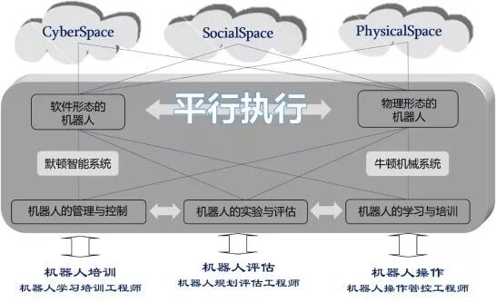 3) 机器人的管理与控制——通过物理和软件机器人的虚实平行互动,在CyberSpace中形成一个关于任务执行的大闭环系统,从而可以利用虚实互动自适应的反馈方式,使平行机器人系统更加准确快速地完成指定的任务,实现对机器人系统的智能控制与管理。