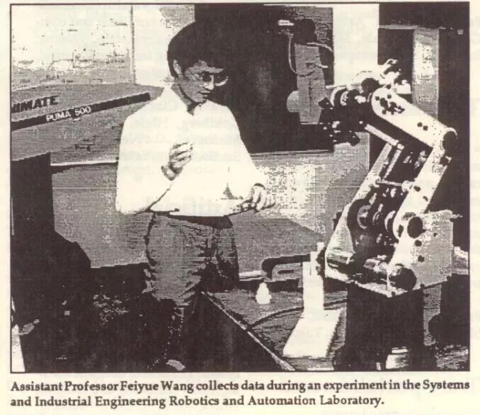 图1 20世纪90年代初本文作者在亚利桑那大学机器人与自动化实验室工作,图中有2个PUMA工业机器人和1个三菱教学机器人