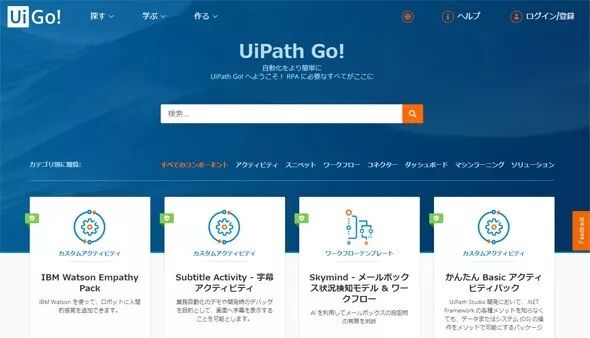 1、发布日语版RPA市场“ UiPath Go!” :UiPath Go!是一个AI合集站点,用户可以在那里下载RPA预设好的自动化组件。在英文版本的UiPath Go!中,该站点为企业和开发人员提供了大约600种AI组件。而日语版本大约有50多种组件,如OCR、NLP、ML、CL、和聊天机器人等。