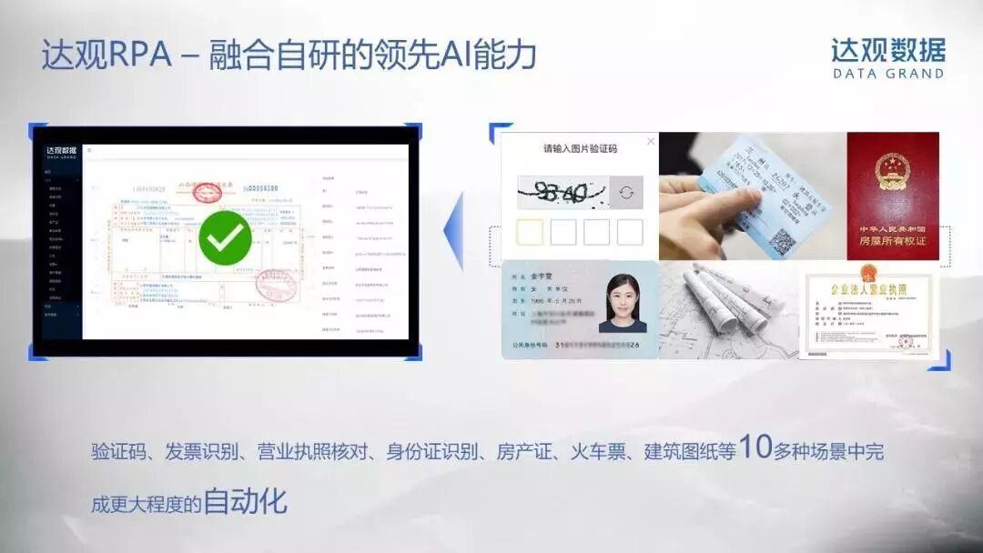 以今年初,达观数据为上海政府提供的一个RPA系统为例,它解决了外籍人士工作许可申请中的各种信息录入和汇总问题。在RPA中结合OCR、NLP(自然语言理解)等技术,让以往需要工作人员对照纸质文件录入、核对的信息实现了自动录入,并能根据字段特征,自动填写到相应系统的相应位置。