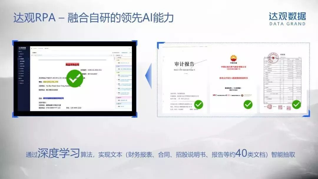 在2019年中,达观数据也推出新产品“智能文本 RPA”,主打 NLP + RPA + OCR,即在机器人里集成了 NLP(自然语言处理) 和 OCR (光学字符识别) 模块,优势在于能做更多复杂应用场景的业务流程自动化。达观数据CEO陈运文表示,在企业流程中,大约 10 - 20%是简单业务流程,其他则是需要人工参与的复杂流程,本次达观推出的 RPA 产品,相当于是传统 RPA 的升级版,能够提高其服务能力。