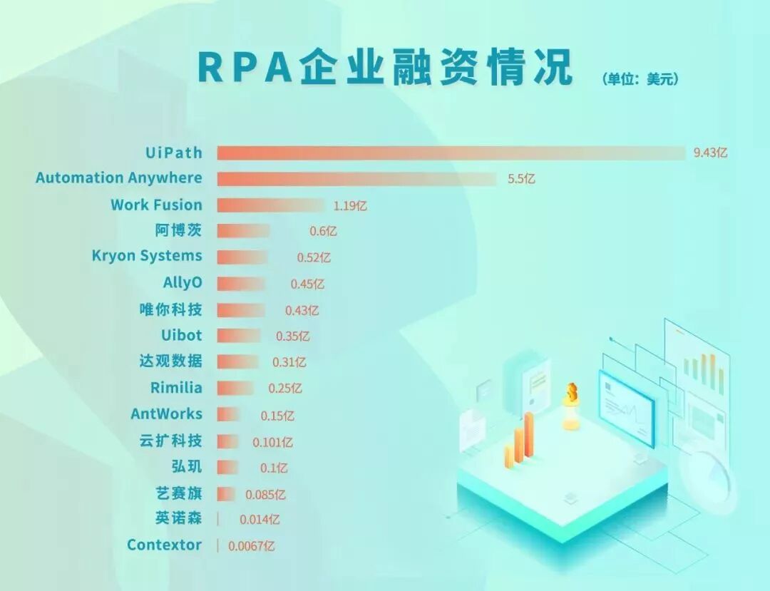 多家RPA企业融资能力强劲,截止2019月,全球融资总额超60亿元,UiPath以9.43亿美元位居首位,达观数据以3100万美元位列第九。而纵观整个2019年,拿到新融资、发布新产品、开启又一轮转型的中国RPA厂商不下10家。