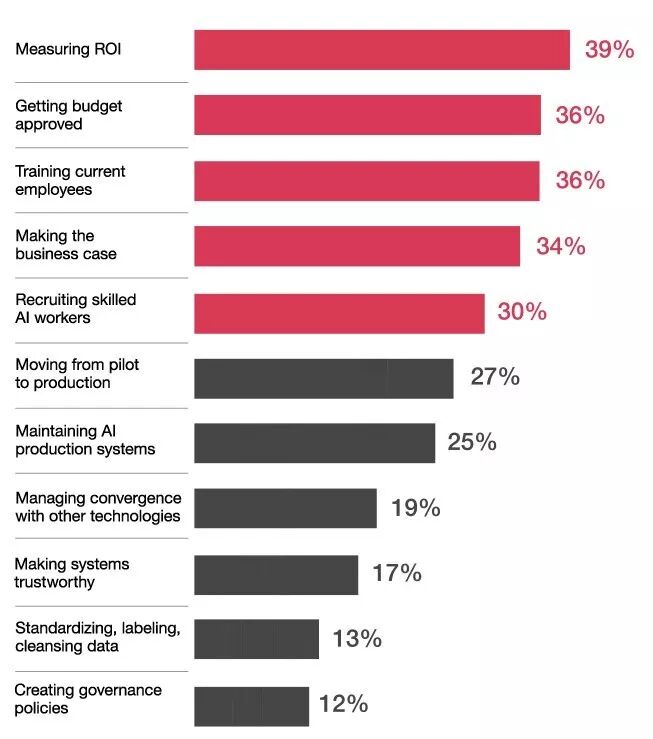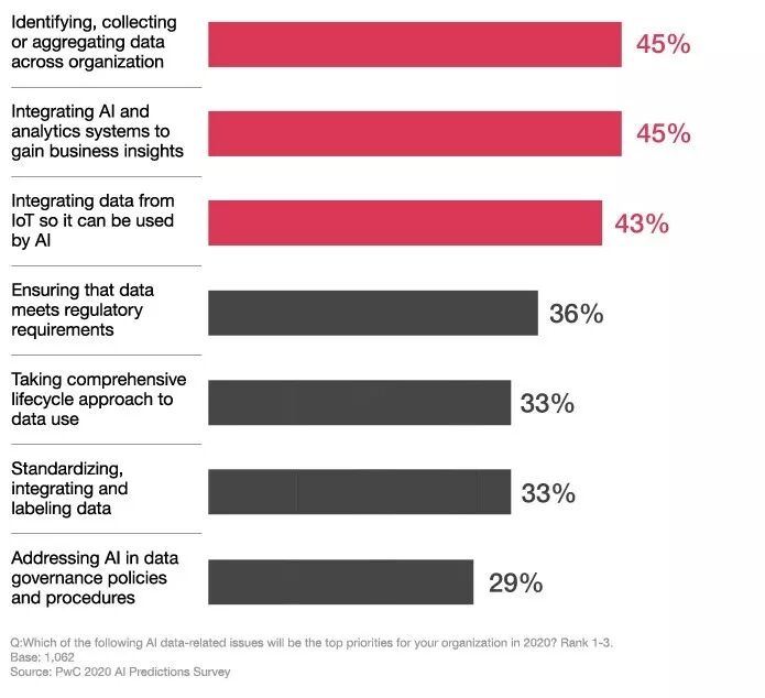 尽管数据是AI实现其价值的关键,但在高管的优先级上对数据并不关心: 只有三分之一的受访者表示这是2020年优先要做的事情,而13%的受访者表示这是一项颇具挑战的任务。