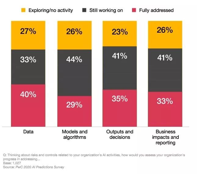 AI可以帮助企业提升安全指数,防护网络攻击,识别那些潜在的恶意攻击。 但是,如果没有完善的监管策略和规则,AI同样会带来反面的风险。 85%受访者表示,他们的组织正在采取足够的措施来防范AI所带来的负面风险。 只有大约三分之一的受访者完全解决了与数据、人工智能模型、输出和报告有关的风险。