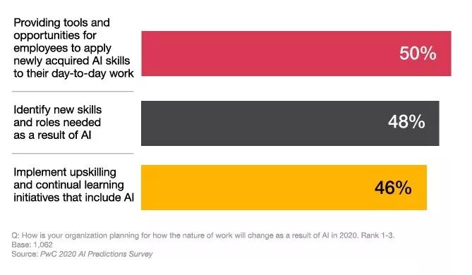 企业为了谋求更好的人才,每年都会在其内部进行大量培训以提升其技能。 不过,50%的受访高管认为,如今的技能提升不仅是业务上,科技上同样重要,例如: 创建数据集,建立机器学习模型或使用Python创建自己的爬虫工具。 这可以帮助员工用AI的思维方式去解决日常工作任务。