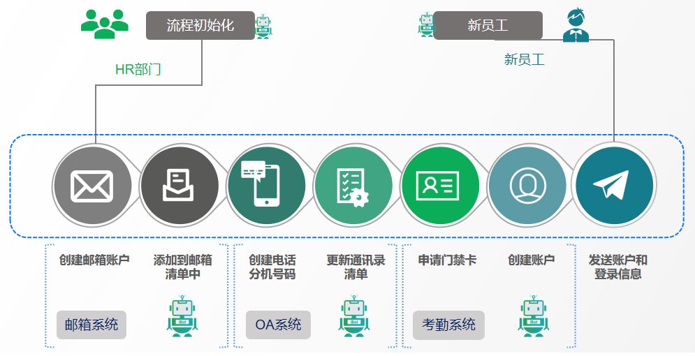 部署RPA后:RPA软件机器人会创建新员工数据信息,自动为新员工在各个业务系统中创建账户和开通权限,同步员工信息到企业的通讯、协作软件中,自动帮助新员工申请办公物资。