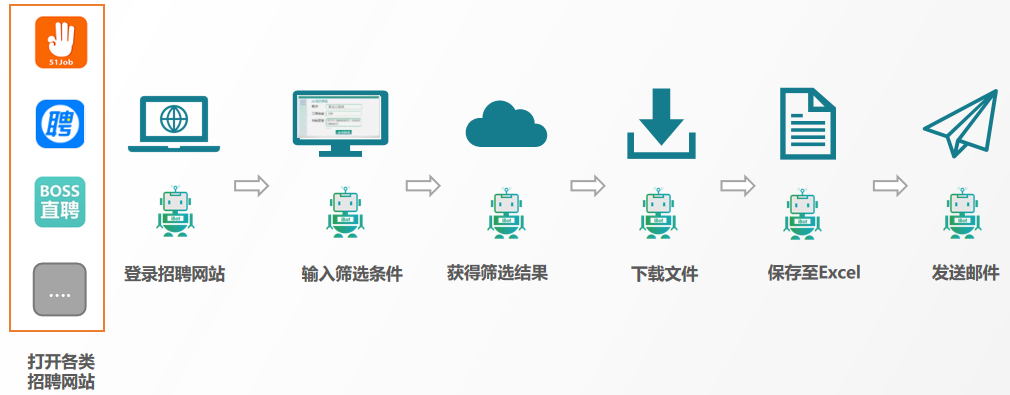 部署RPA后:RPA软件机器人可以自动登录招聘网站,根据招聘需求和提前设置的条件对简历进行筛选,选出适合的候选者简历后自动下载存储到指定位置。RPA还可以将特定的简历信息按照一定的字段整理成表格方便后续查阅,也可自动录入到企业的人才库管理系统中。