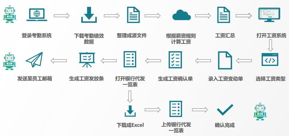 部署RPA后:RPA软件机器人会自动到考勤系统下载所有员工的考勤数据,结合其他薪资约定规则,自动计算出每位员工应得工资,将数据整理汇总后,录入工资系统。还可以自动向员工发送工资条以及处理工资发放事项。