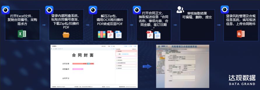 法律合规部每月初需要将上个月新增的采购合同,上报到集团的风险管理及合规信息系统进行备案,每月增量合同在百份级,对于盖章的扫描件合同,均需要肉眼查找并人工填写报送信息,耗时30分钟/份合同以上。