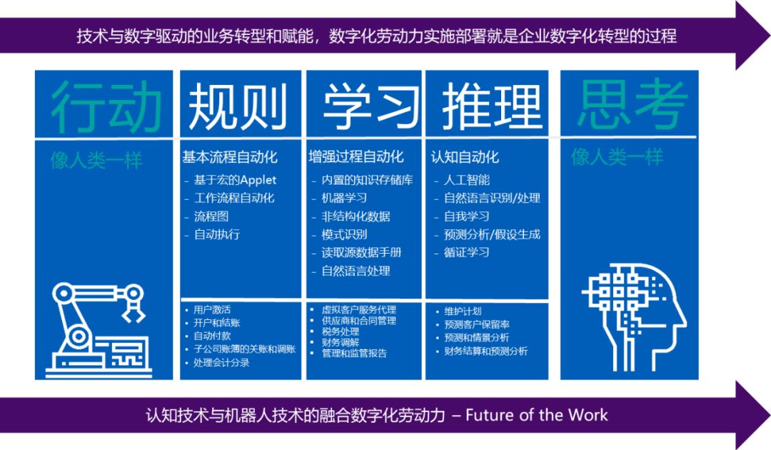 2、 机器人自动化和认知技术的结合使得人工操作自动化的同时赋予机器人学习推理的判断能力。这些技术的综合应用可以帮助提高高端专业人员(如高管、会计师、律师和科学家)的决策能力,实现业务决策的自动化和数字化。