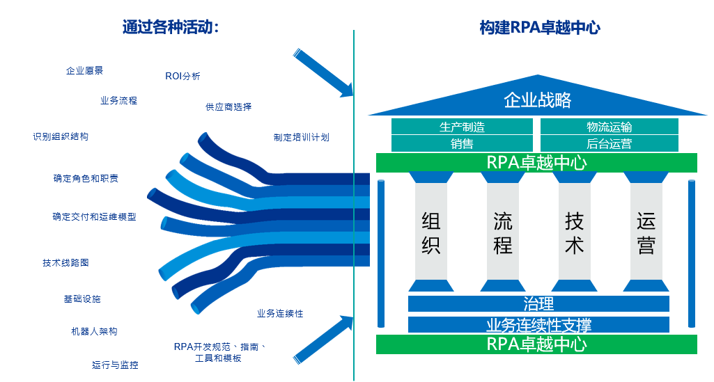 我们希望卓越中心可以在公司宏观战略的指引下,可以成为像生产部门、物流运输部门、销售部门、后台运营部门一样的必需组成部分,为其他部门提供源源不断的流程标准化和自动化服务。