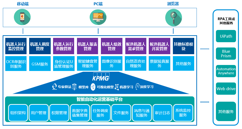 机器人军队需要的基本弹药都可以通过平台获取,比如OCR服务、GSM服务、票据验真服务、U盾管理服务等
