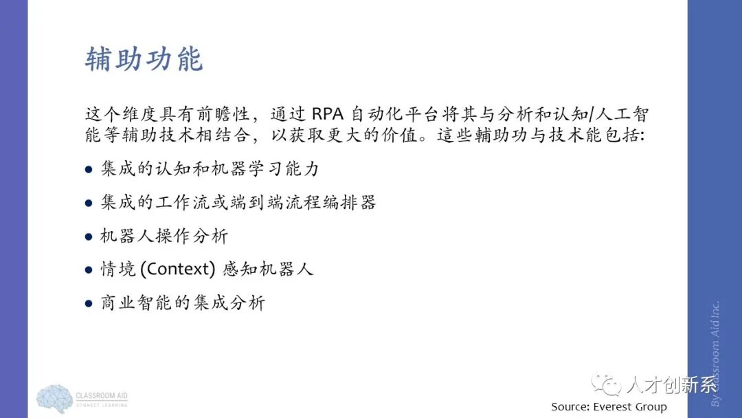 认知 RPA (RPA 4.0) — 能进一步与人工智能技术集成,包括但不限于机器学习和自然语言处理。人工智能不仅能处理流程中的非结构化数据,还能增强 RPA 自身的能力,例如使用计算机视觉来改进在屏幕上查找目标。