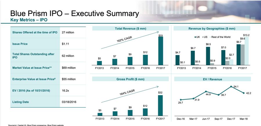 2017年,RPA市场先在海外兴起。前一年在伦交所上市的RPA巨头Blue Prism迎来了创业以来最陡峭的增长势头,营收同比增长275%,达到3300万美金;蓝筹客户数增长到74个,内部雇员从43人增长至187人。