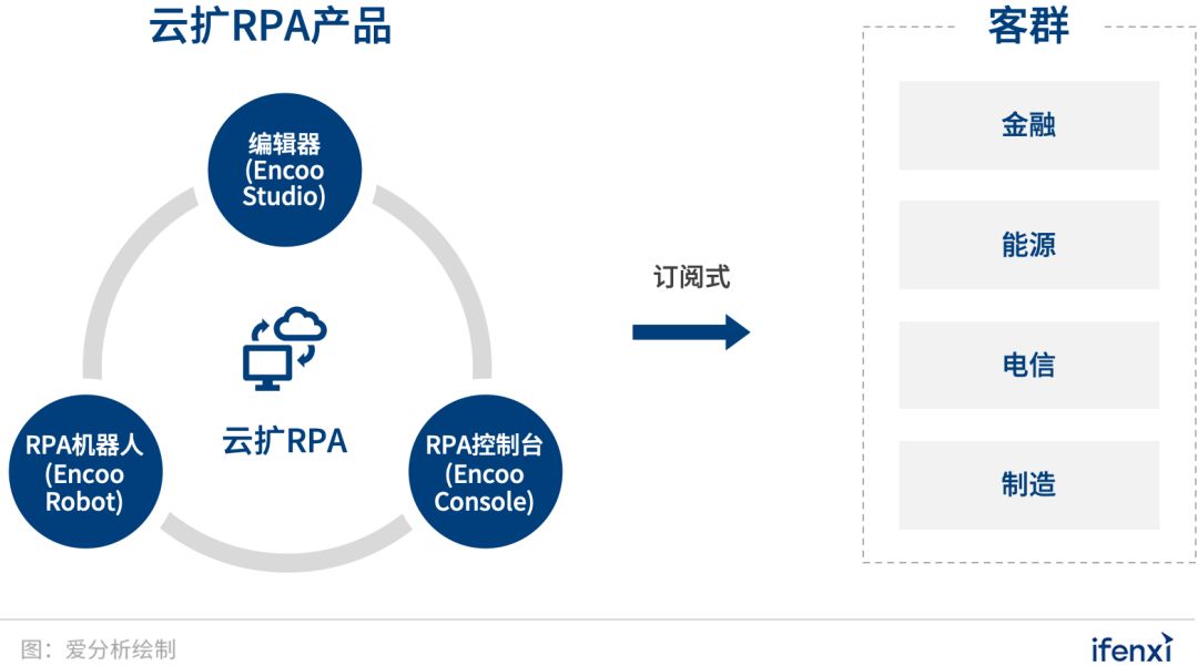 云扩科技成立于2017年7月,旗下RPA机器人产品“Encoo Automate”面向金融、能源、电信、制造四大行业提供智能流程自动化服务。