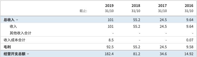 以这个赛道中唯一上市的企业BluePrism为例,根据其2019年的财报(截止2019年10月31日),全年收入为1.01亿英镑,但销售、管理、研发等支出费用1.82亿英镑,亏损高达7820万英镑。而从2016年至2019年,其财报一直显示处于亏损状态。