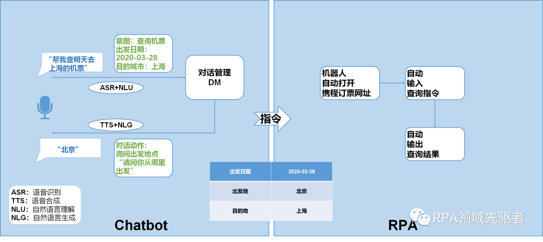 机票自动查询机器人是通过与对话机器人进行语音交互,来让机器人自动在网站查询指定日期从哪到哪的机票信息。当我们说到“帮我查明天去上海的机票”的时候,会通过ASR自动将语音转换成文本,再由NLU进行自然语言理解,机器人会触发用户想要查询机票的意图,然后自动进行实体抽取,根据“明天”计算出明天的出发日期2020年3月28日,以及目的地上海,机器人同时会将当前用户消息中的实体填充到词槽中,发现出发地是空的,这个时候机器人会发出询问,通过NLG进行自然语言生成,再用TTS进行语音合成,来和人进行语音交互“请问你从哪里出发”,来获取出发地。