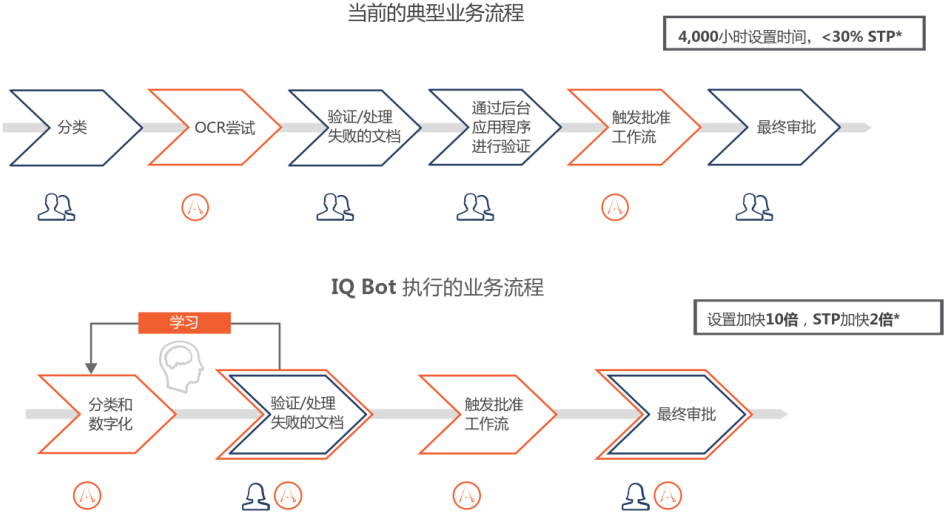 但RPA+AI可对整个流程实现自动化,消除人为错误。智能RPA可以查找并识别相关数据,甚至可适用于各种不同类型的文档。