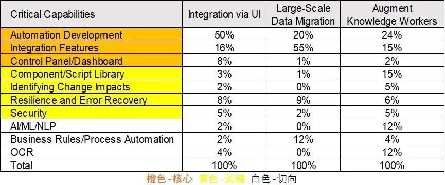 Gartner挑选了10个关键性技术,分为核心(必须具备)、关键(支持RPA开发和部署)、切向(RPA相关技术),从UI集成、大规模数据迁移和强化知识员工三个方向进行评测,10项技术在3个方向上的权重有所不同,见下表: