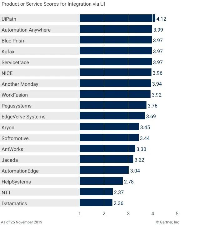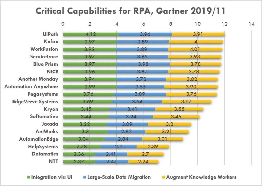 故而在19年12月,Gartner推出了《RPA关键能力报告》,完全从技术角度评测市场主流RPA产品,作为其RPA幻方图的补充。