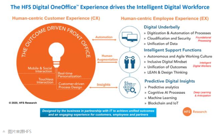 OneOffice体验代表了如何将客户、合作伙伴和员工的体验融合在一起,以驱动统一的思维方式、目标和业务成果。OneOffice将以客户为中心的体验通过我们过去称为前端和后台办公室的端到端流程进行设计和支持概念化。如今的RPA机器人在实质上已经嵌入“数字底线”,成为了构建企业基础处理层的一部分,而创造出更加智能的,可以增强人来办公能力的工具正是RPA未来的发展趋势。当今的软件供应商能够开发出超越当前静态工具的机器人,可是这些静态工具实际上只是保持旧进程的分块运行。智能数字劳动力正在成为一种使能技术,它正逐渐成为开发CX设计和交付经验的关键组成部分。