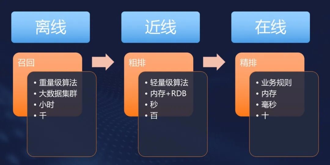 三层架构分别对应召回、排序、后处理这个标准化流程。离线召回主要是海量数据分析挖掘的算法,比如各种深度学习模型、协同过滤模型等,一般是小时级,生成在千这个维度的候选集。近线主要是对推荐结果进行初排,包括线性的、非线性的、深度学习等各种各样的排序模型。在线可以对近线的结果进行各种业务规则的后处理逻辑,包括强制推荐、时效性、多样性的控制等,主要是内存型的计算,可以在几十毫秒左右生成10条左右的结果返回给用户。