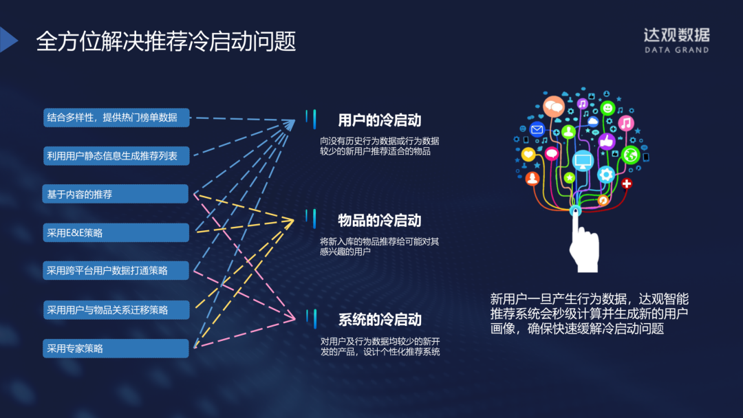 基于海量的数据来说,我们会在推荐里常常遇到冷启动问题,一般包括用户的、物品的、系统的,达观对这几块都有解决流程,比如做高热、专家规则和UCB算法等,都可以灵活调整上线,快速完成冷启动问题的解决,并带来用户体验和效果提升。